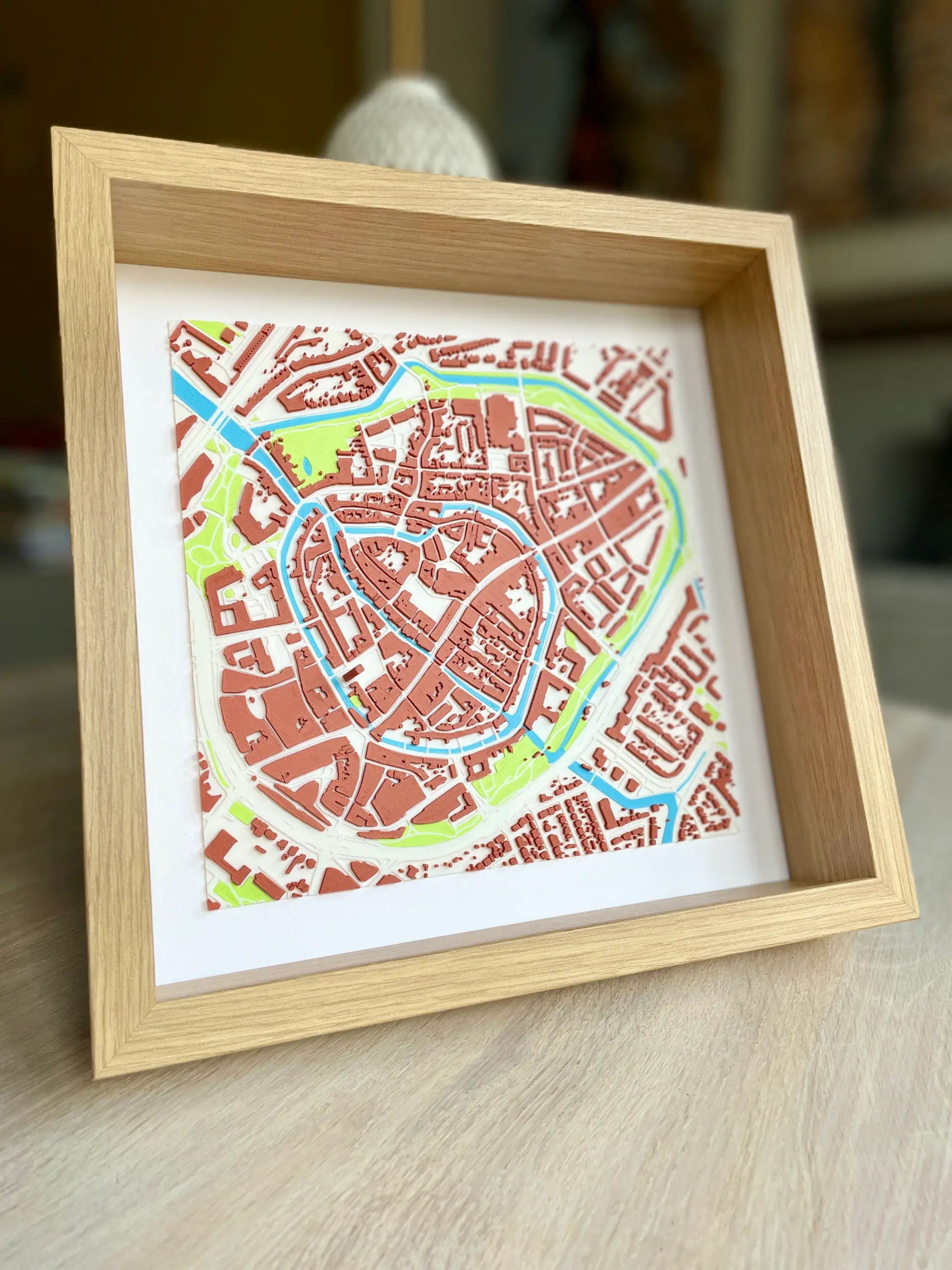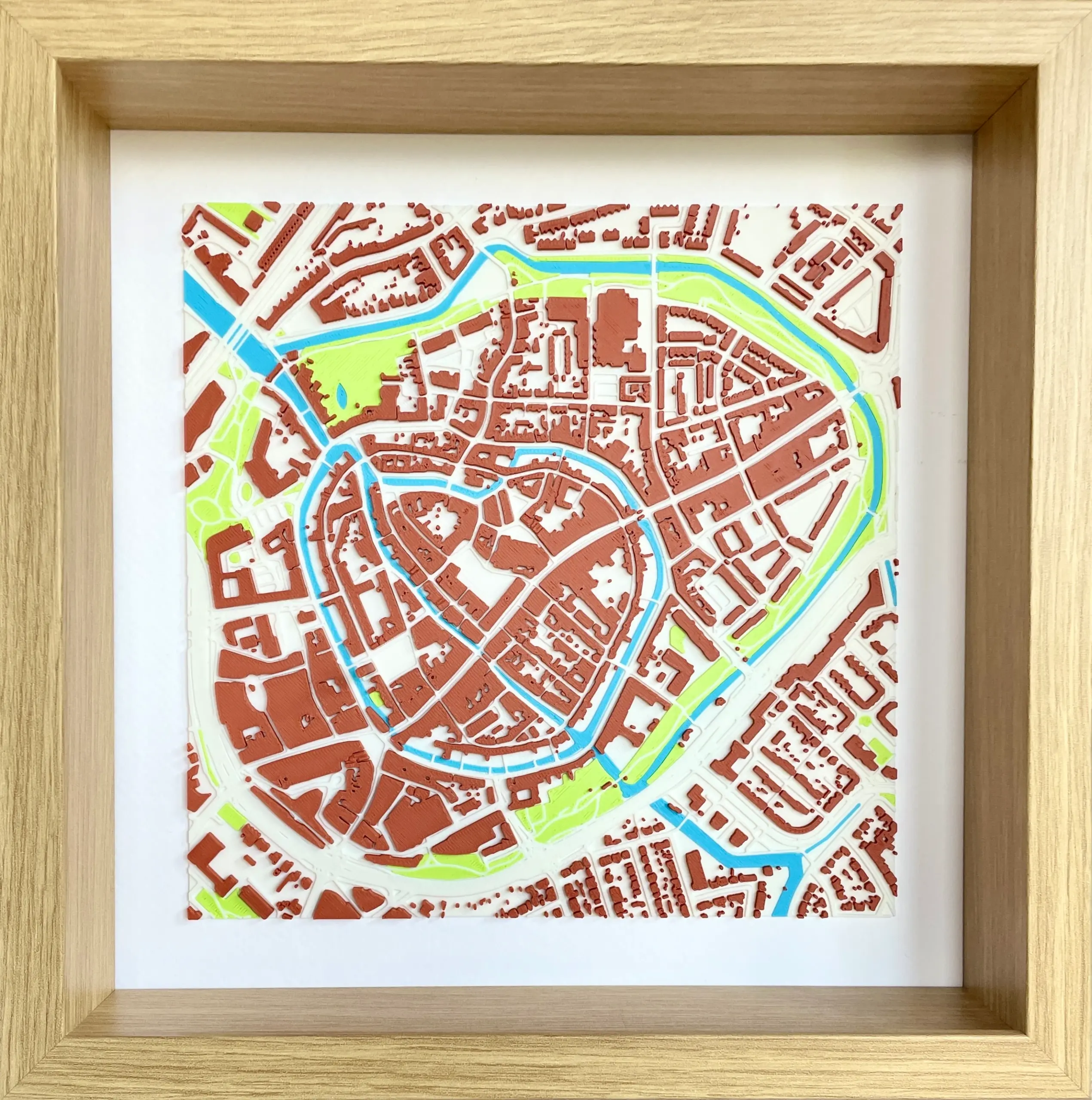 - Afmetingen stadsmodel: 20 × 20 cm (lijst 27 x 27 cm)
